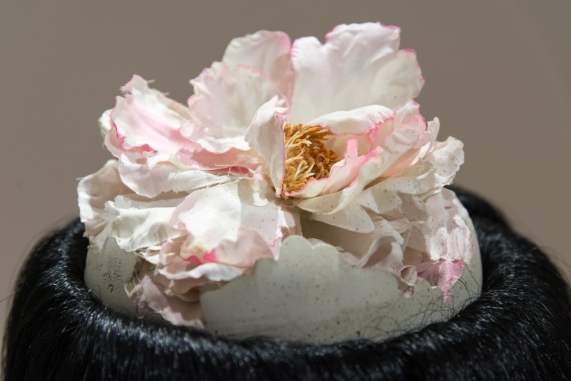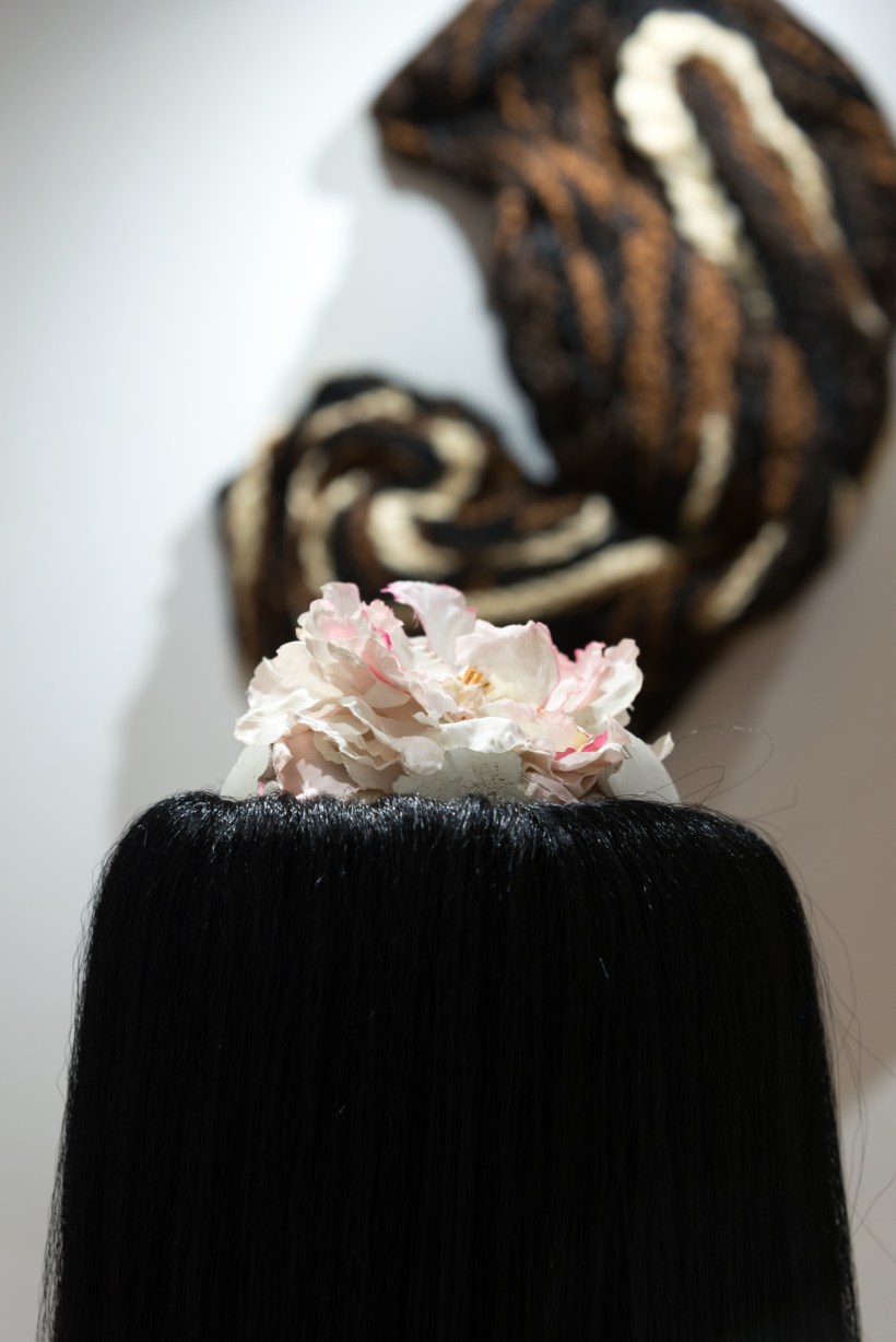 saudade, 2017 hair, steel, mortar, fake flower 8” x 15” x 5”