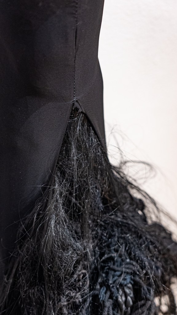 Simultaneously, Perez’s cushions imply a need for rest, markedly contrasting with the intricate and tedious labor that created the forms built with artificial hair. And yet, the need for rest coils in on itself, reflecting our contemporary condition of tortuous unease with the concept of rest. These new sculptures give their visual weight to labor exploitation past and present and its attendant forbidden rest. The horror influence on Veronica’s work here lurks just beneath its pillowy surface. The cushions beckon one in with a promise of comfort. Once engaged, the work invites an interrogation of what it means to “rest easy,” and who holds us as we sink into form-fitting foam comfort.