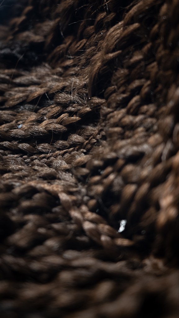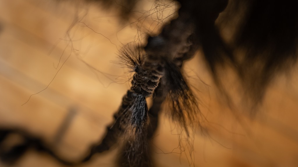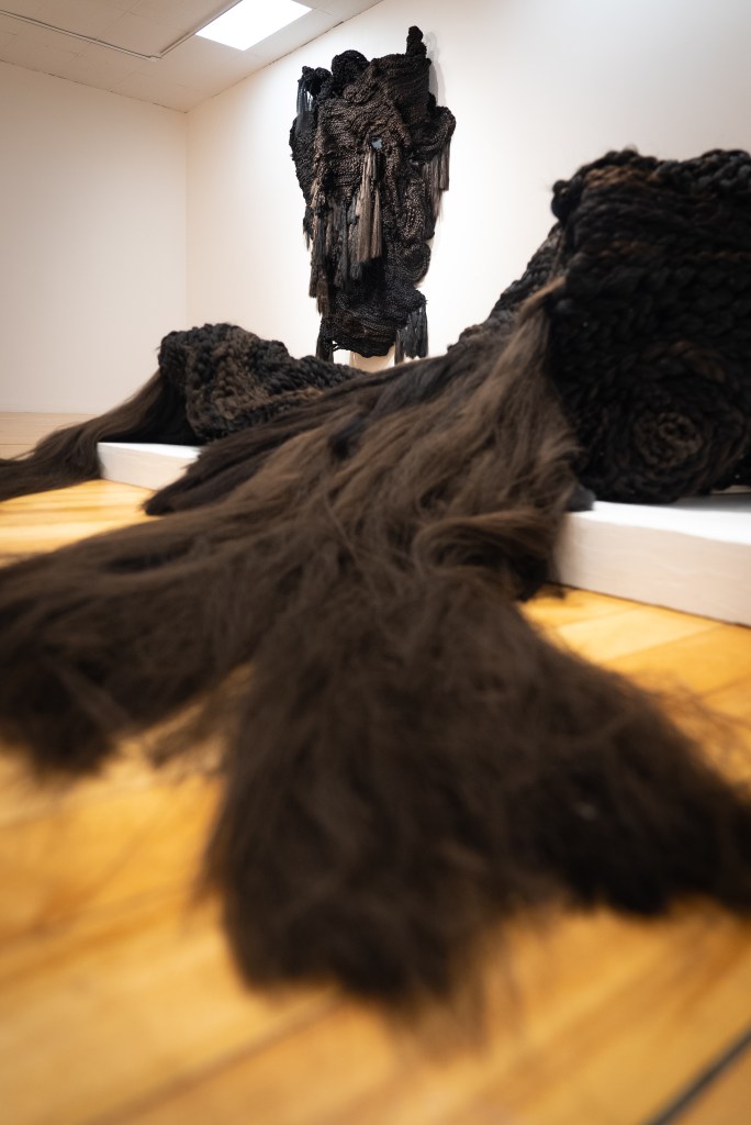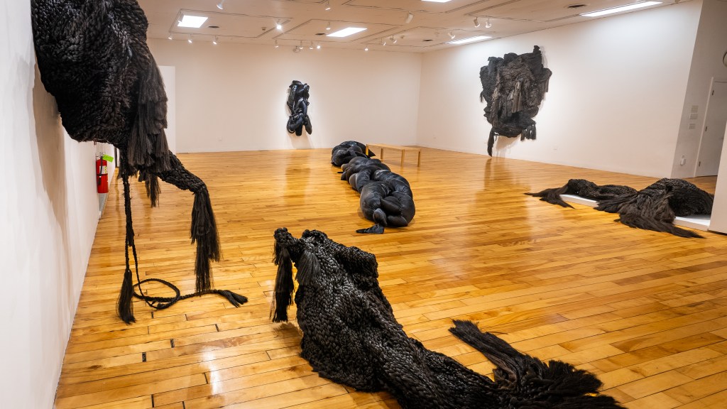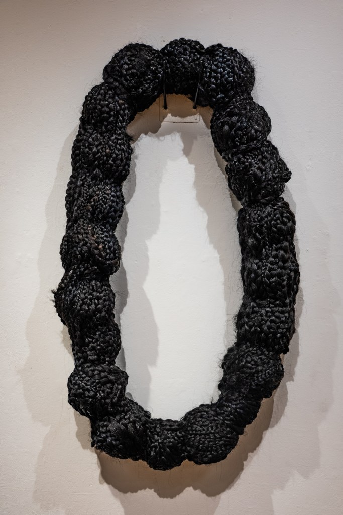 Through these lenses, Perez’s braids can be understood as representing the past, present, and future, creating a multiverse through their combination. With the incorporation of first-hand accounts and memories of hair, the sculptures gain multisensorial resonance. Ever-expanding and encompassing, Perez’s sculptures creep toward the viewer and swallow the austere architecture of the gallery with the weight of first-hand histories made manifest, hinting at depths untold, inaccessible, and unknowable — but whose acknowledgment, memories, and imagination can give way to a future that prioritizes joy.