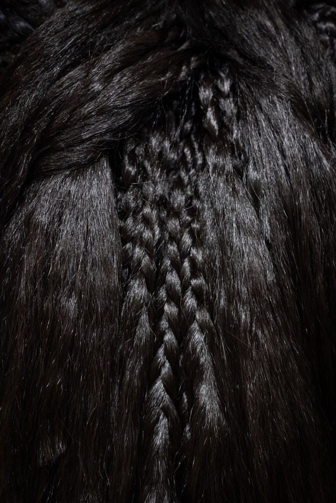 Hair, and the styling of hair, are heavy with cultural significance. Perez’s works contain incalculable numbers of braids, weighing upon one another. As their work grew in scale, they involved community participants to braid the artificial hair that comprises their sculptures. As participants braided, they discussed the memories that the act conjured. Perez found that the action of braiding was enabling somatic processing, with its repetitive movements allowing practitioners to enter a meditative state and access memories that may not otherwise be recalled. Perez was compelled to capture these moments and built an oral history archive rooted in the personal experiences of Black, Brown, LatinX, Indigenous, and Asian communities focused on hair. Without Perez’s workshops and the somatic processing they facilitate, these experiences may otherwise never be recalled, archived, or shared. These stories are now incorporated into Perez’s sculptures. Participant memories, and their subsequent sharing via artwork, allow others to experience first-hand the link between hair and identity.
