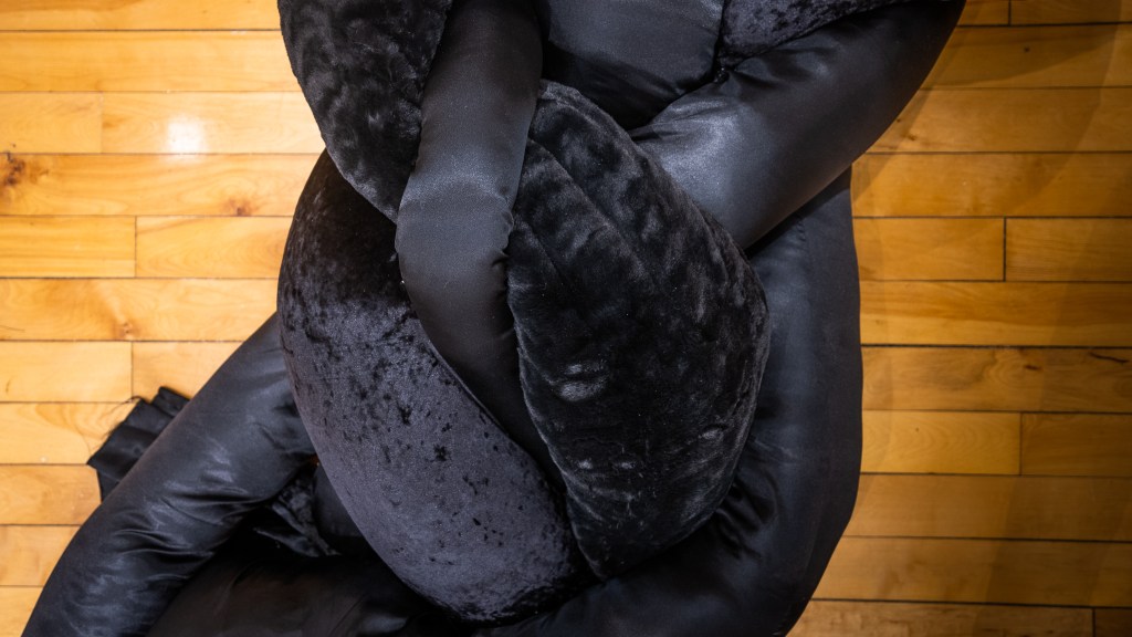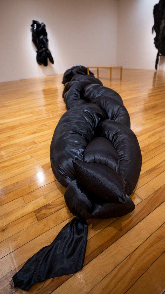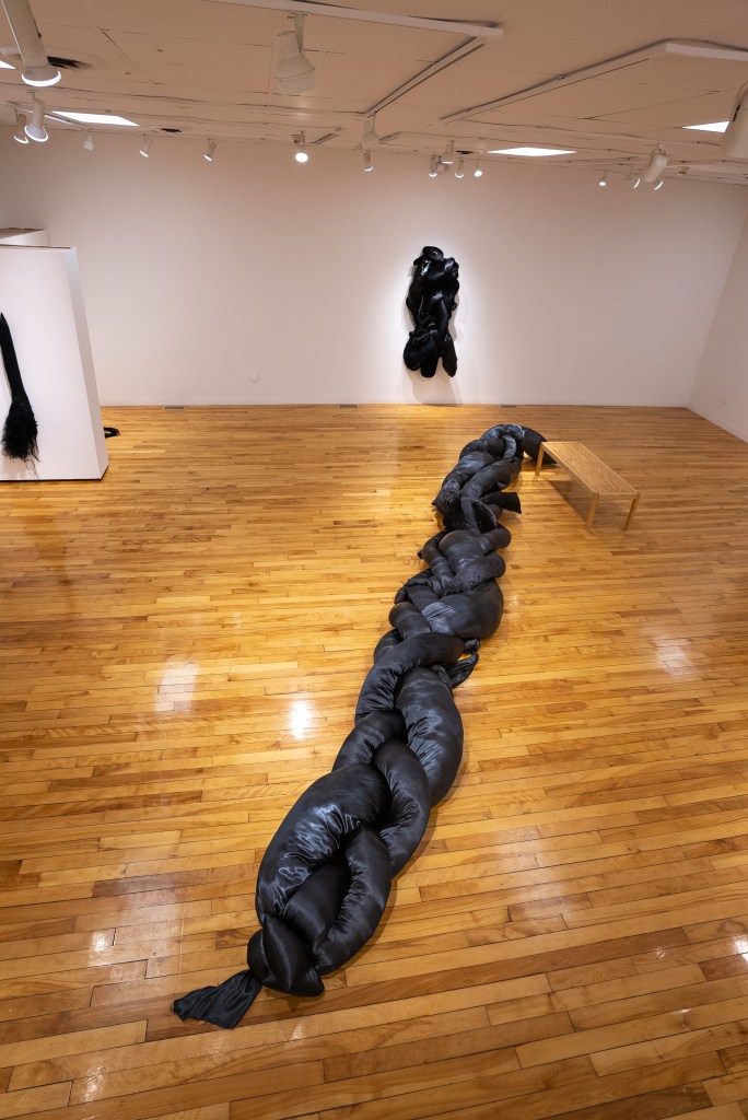In addition to the communally braided sculptures, shadow / echo / memory showcases new directions in Perez’s practice. Thin strands of hair no longer compose the braids. Instead, thick, long pillows twirl around one other. The fabrics Perez utilizes in these new sculptures shine and glimmer against a black ground. They recall interstellar skies or depths of the sea in which light fades to a murky shimmer. In this way, Perez’s materials mimic the phenomena that envelop us above and below and yet are fundamentally unknowable.